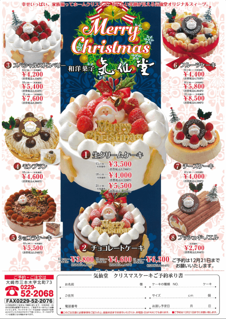 【三本木・気仙堂】クリスマスケーキご予約受付中!