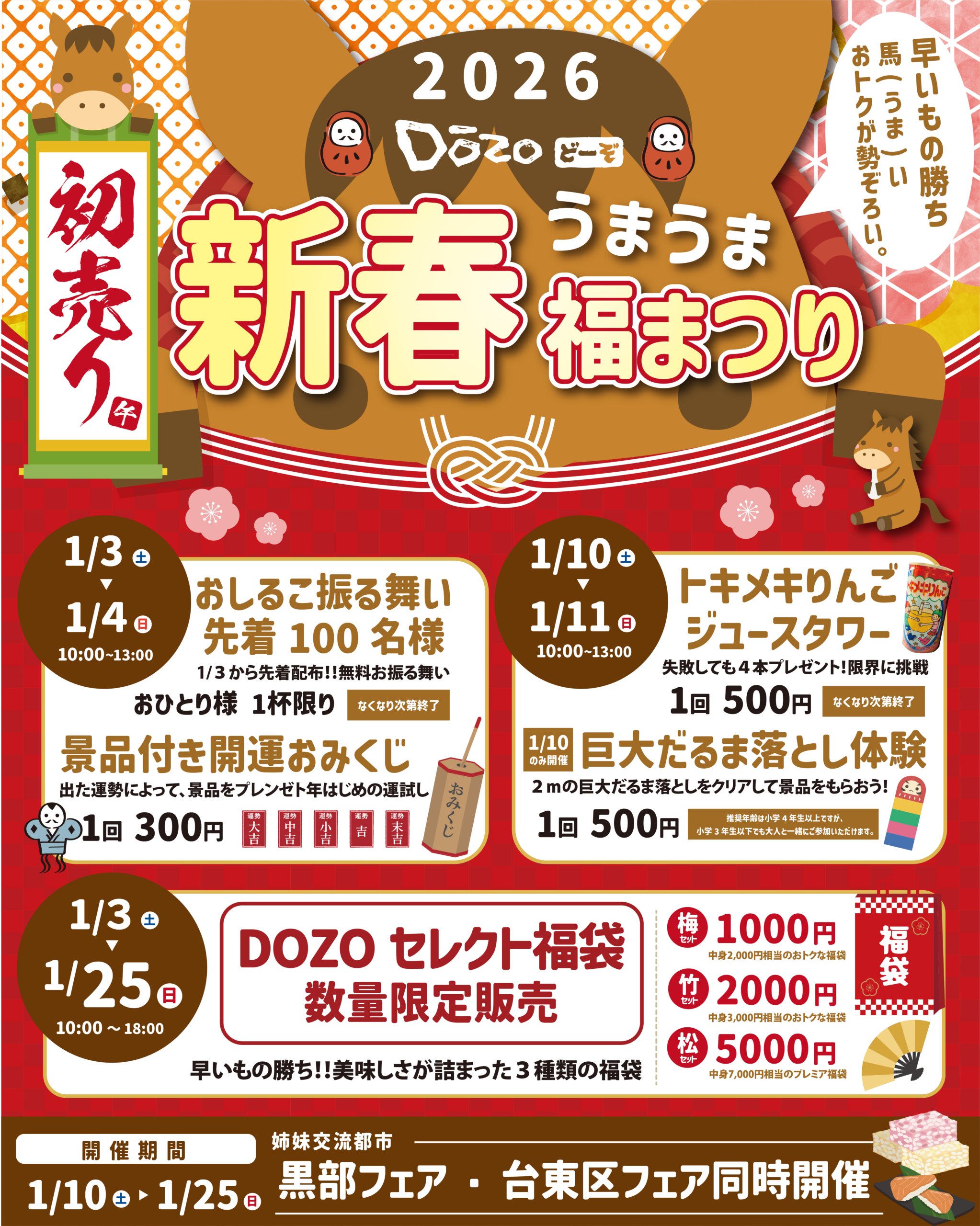 新年の運試しや、家族で楽しめる体験イベント、お正月ならではのおトクな福袋販売など、DOZOならではの”うまうま”な企画が盛りだくさんです。