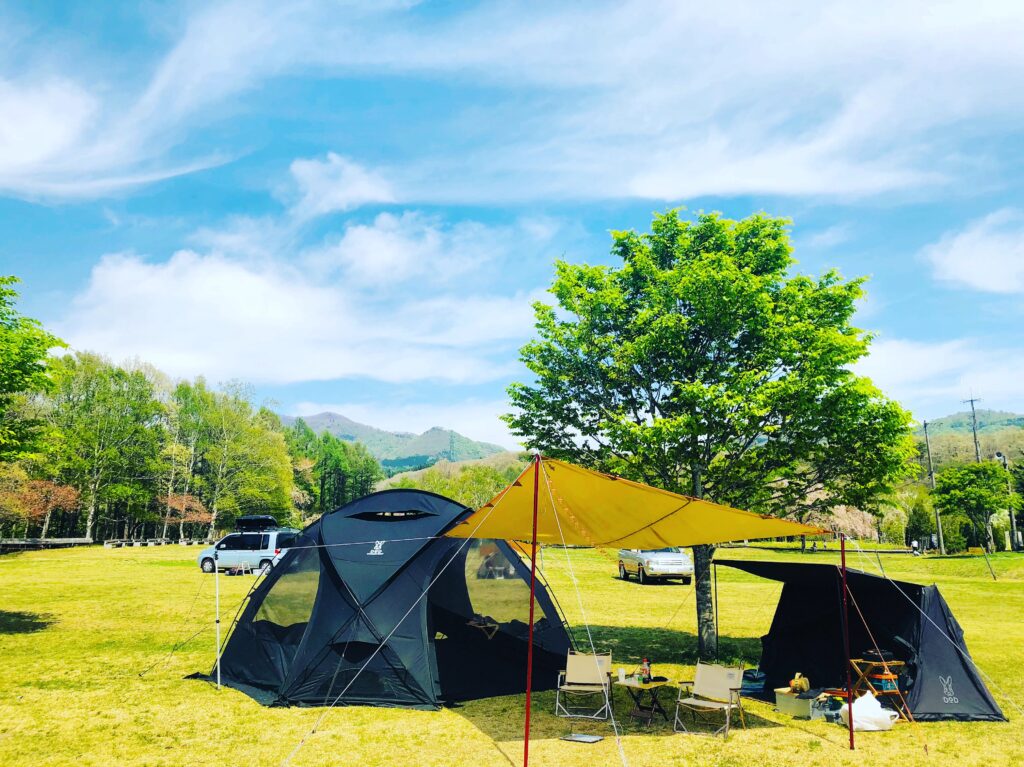 芝生のフリーサイトで開放的なキャンプ